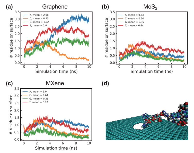 圖3、(a-c)在10ns 的模擬過程中,DNA 堿基的平均數量分別吸附在石墨烯、 MoS2和 MXene 的表面。(d)吸附在石墨烯表面的聚 dA16的快照。