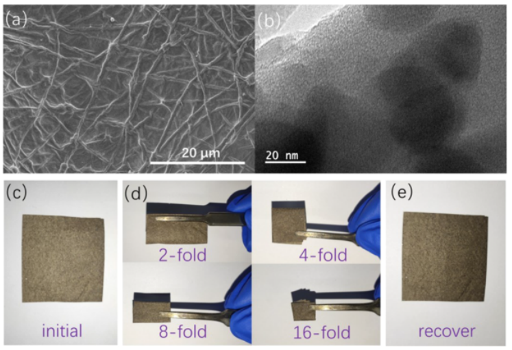 圖2. (a,b)矩形電極在(c)初始狀態(tài)、(d)折疊狀態(tài)和(e)恢復(fù)狀態(tài)下的SC-CP-g .(c e)光學(xué)照片的SEM和TEM圖像。