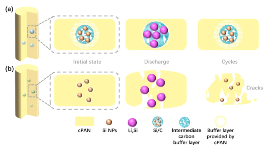 環(huán)狀聚丙烯腈(cPAN)具有良好的柔韌性、彈性和導(dǎo)電性,是一種很有前途的柔性器件基材或粘合劑材料。然而,僅僅依靠 cPAN 的有限彈性和導(dǎo)電性來適應(yīng)大體積膨脹和提高鋰離子電池硅負(fù)極的特殊速率能力是不可行的。在這里,我們報(bào)道了一種基于多維多功能結(jié)構(gòu)設(shè)計(jì)的具有良好柔性的硅/碳-cPAN-石墨烯(SC-CP-G)復(fù)合膜,它可以用作鋰離子電池的獨(dú)立集成陽極。在該集成電極中,硅納米顆粒被包裹在具有原位形成的受限空間的多孔碳中,并且硅/碳顆粒進(jìn)一步嵌入 cPAN 納米纖維中,其與還原的石墨烯氧化膜不可避免地交織在一起,形成互穿網(wǎng)絡(luò)結(jié)構(gòu)。獨(dú)特的層次結(jié)構(gòu)和功能結(jié)構(gòu)設(shè)計(jì)大大提高了硅電極的機(jī)械性能,循環(huán)穩(wěn)定性和容量可及性,在2Ag