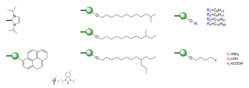 圖5. (a) 1,3-二異丙基-5-(芘基)-1H-苯并[d]咪唑碘化物(2),(b) 1,3-二異丙基-5-(十二烷氧基)-1H-苯并[d]咪唑碘化物(3)/1,3-二異丙基-5-(己氧基)-1H-苯并[d]咪唑碘化物(4),和(c) 1,3-二異丙基-5-(氨基丁氧基)-苯并[d]咪唑碘化物(5)的合成。