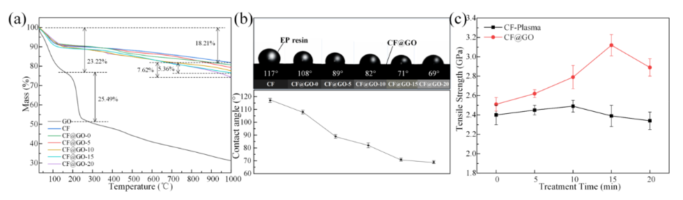 圖6. (a) GO、CF、CF@GO的TG曲線。(b) EP樹脂在CF和CF@GO上的接觸角。(c)不同NH