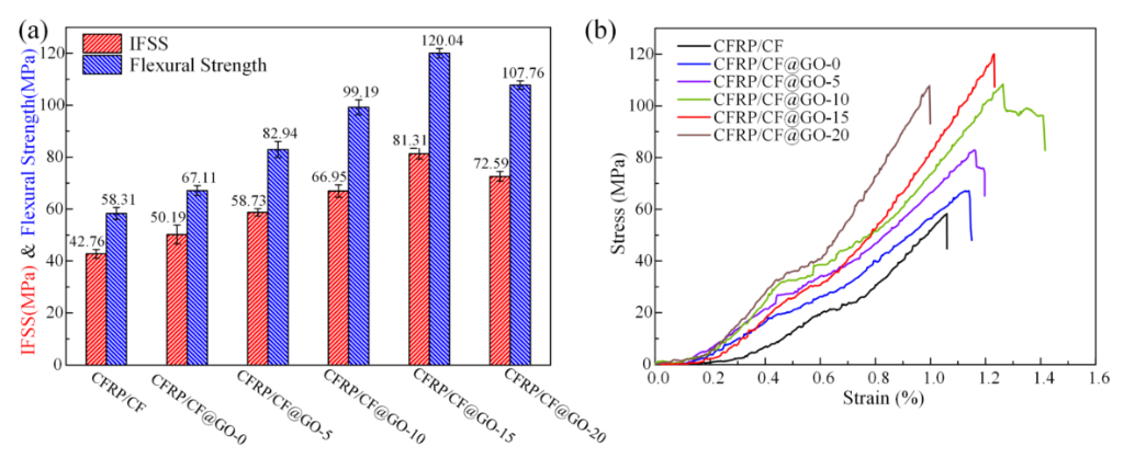 圖8. (a)CFRPs的IFSS和彎曲強度。(b) CFRPs的彎曲應力-應變曲線。