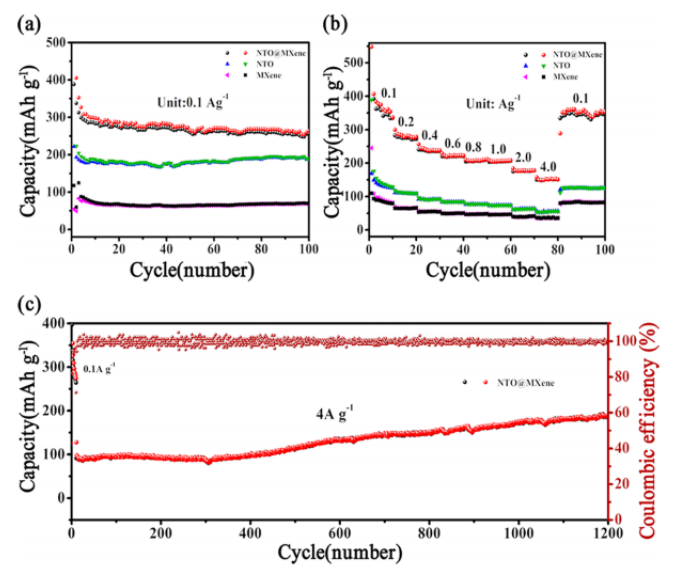 −1下的循環(huán)性能;(b) NTO@MXene、NTO和MXene陽極的速率性能;(c) NTO@MXene在4A g