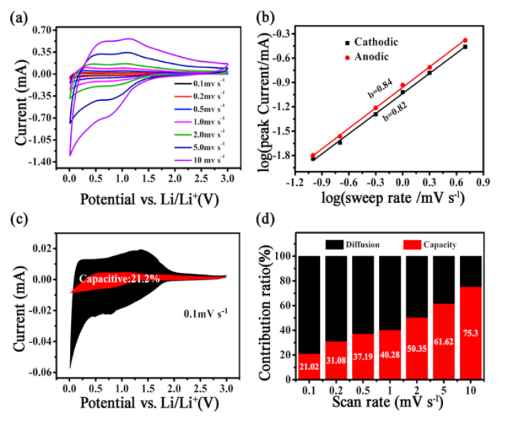 圖5。(a) NTO@MXene在不同掃描速率下的CV曲線,(b)利用log i和log v圖之間的關(guān)系確定b值,(c) NTO@MXene在0.1 mV s−1時電容控制的貢獻(xiàn),(d)不同掃描速率下電容控制的容量貢獻(xiàn)趨勢。