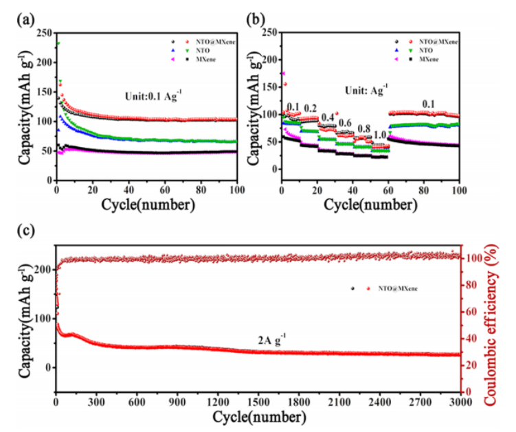 −1下的循環(huán)性能;(b) NTO@MXene、NTO和MXene陽極的速率性能;(c) NTO@MXene在2 A g