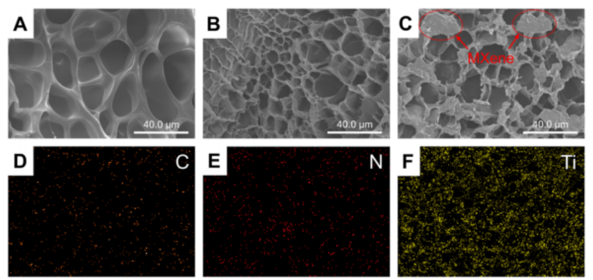 圖4. Ti3C2Tx MXene與三種水凝膠(A)的FTIR光譜。三種水凝膠的TGA (B)、DTG (C)、DSC (D)曲線和三種水凝膠的存儲模量(E)、損耗模量(F)曲線。