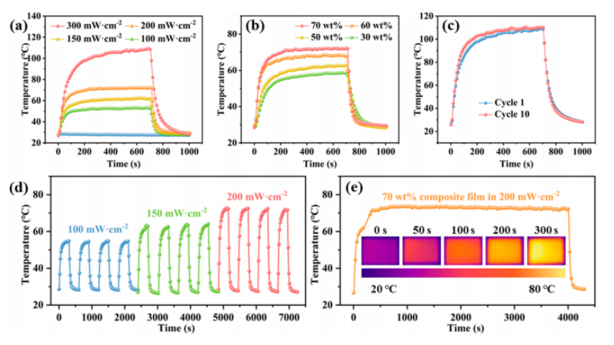 2光照下在第1次和第10次加熱/冷卻循環中的光熱曲線。(d) 70 wt % MS/WPU復合膜在反復加熱-冷卻循環和不同功率密度下的光熱曲線。(e) 70 wt % MS/WPU復合膜在200 mW/cm