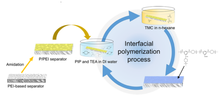 -1),受到了廣泛關注。 然而,鋰金屬負極不穩定、能量效率低和電解質分解等關鍵問題嚴重阻礙了其應用。 在此,我們提出了一種基于界面聚合(IP)的隔膜改性方法來解決這些問題。 得到的界面聚合層在聚醚酰亞胺(PEI)隔膜表面表現出良好的離子選擇性滲透性,極大地抑制了電極間較大的EMIM