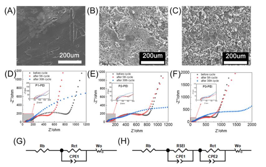 2 電池鋰金屬拆解的 SEM:(A-C) 分別為循環前、第 1 次循環后和第 30 次循環后的鋰金屬。 具有 (D) P1-PEI、(E) P2-PEI 和 (F) P3-PEI 隔膜的 Li-O