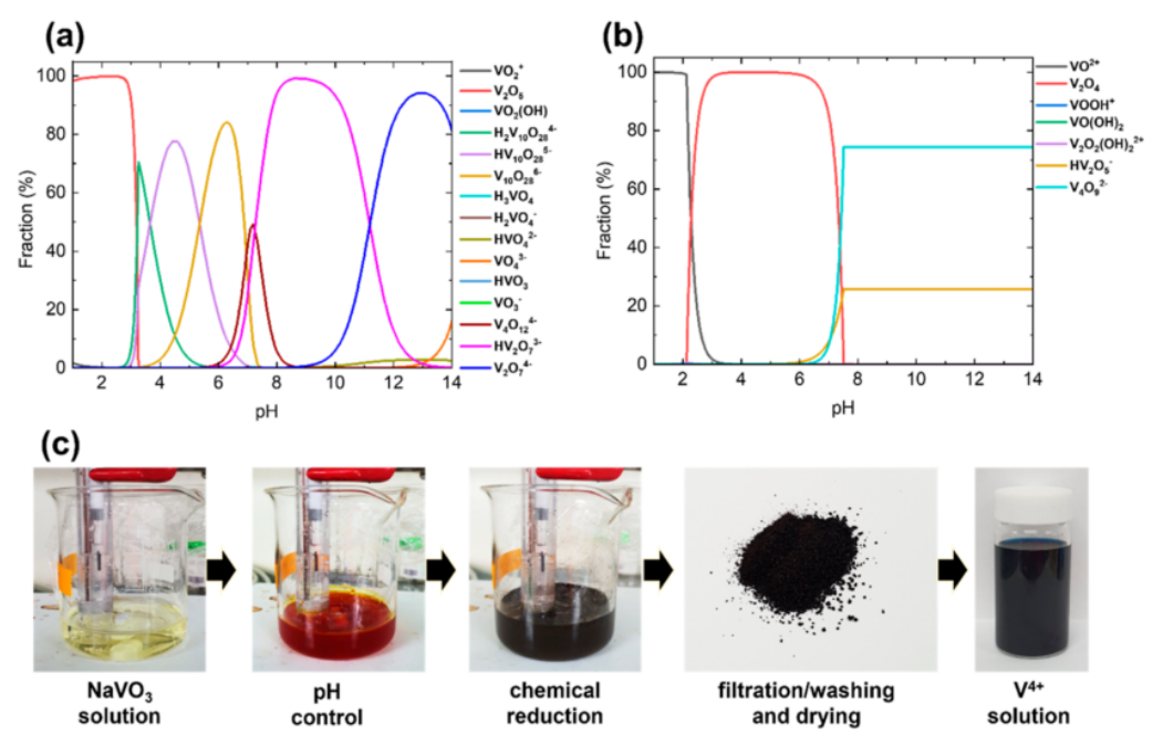 圖 2. 平衡 (a) V(V) 和 (b) V(IV) 物種根據(jù)溶液 pH (HSC 7.0) 建模和 (c) 從 NaVO3 溶液中制造含有 V(IV) 的硫酸鹽溶液的圖片。