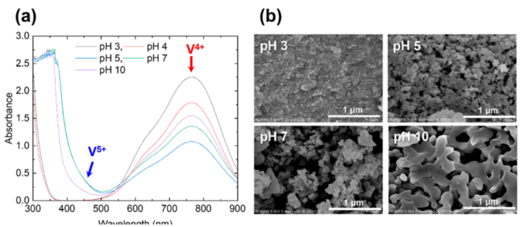 圖 4. 在不同 pH 值下回收的顆粒的紫外可見光譜 (a) 和 SEM 圖像 (b)。