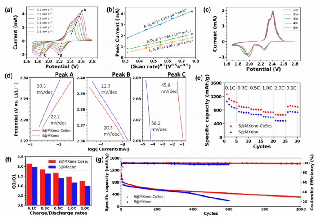 圖5 (a) S@MXene-CoSe2球體在0.1 ~ 0.6 mV/s掃描速率下的CV曲線;(b) a、b、C位置的掃描速率依賴性峰值電流。(c)掃描速率為0.1 mV/s時S@MXene-CoSe2球體的初始CV曲線。(d)從CV曲線導出的相應峰位置的S@MXene和S@MXene-CoSe2球體的Tafel圖。(e) S@MXene-CoSe2和S@MXene陰極的速率性能比較。(f)根據不同充電/放電速率的充電-放電曲線計算出的Q2/Q1比值。(g) S@MXene-CoSe2和S@MXene陰極在0.5C下的長期循環性能。