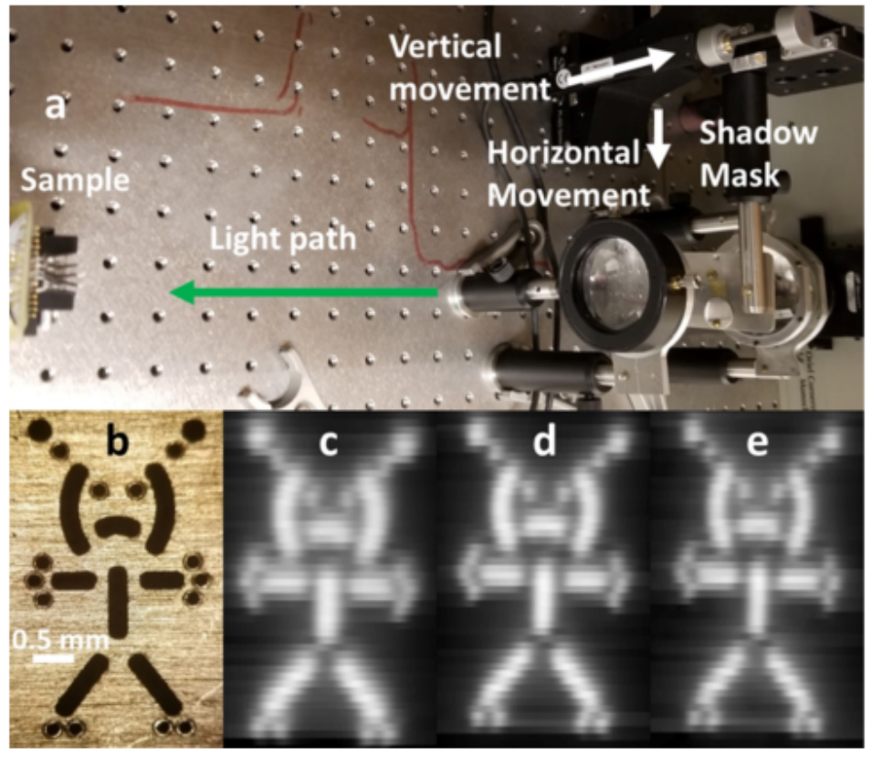 圖5。(a)顯示陰影掩模位置的圖像掃描系統(tǒng),透過線性致動器水平和垂直掃描,以取得安裝在“樣本”位置的九通道 PbSQD/石墨烯傳感器陣列上的傳輸圖像。(b)透過光束掃描以在陣列上產(chǎn)生傳輸圖像的陰影掩模的光學(xué)圖像。(c-e)通過在(c)400,(d)500和(e)1000nm 的波長的襯底上的九通道 PbS QD/石墨烯傳感器陣列獲得的圖像。