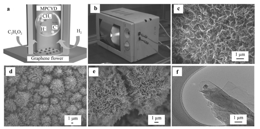 b基于微波爐的自制MPCVD裝置,在微波爐內等離子體清晰可見;
