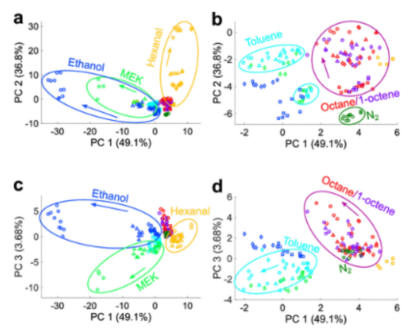 max或TR衍生參數(shù)的PCA評分圖,顯示了測量響應(yīng)對主成分(a,b)1和2以及(c,d)1和3的投影,這些都解釋了數(shù)據(jù)中89.5%的變化。標(biāo)記符號表示氣體濃度(圓圈:100%;三角形:50%;菱形:10%;正方形:1%飽和蒸汽濃度),顏色表示所標(biāo)記的氣體種類。箭頭指示氣體種類內(nèi)濃度增加的方向。PC 1和PC 2中的乙醇和MEK基團(tuán)有些重疊;然而,它們在較弱的PC 3中是不同的。(b)和(d)中的圖分別是(a)和(c)的放大版,以顯示包含辛烷、1-辛烯、甲苯、氮?dú)獾木o密團(tuán)簇的細(xì)節(jié),以及其他三種氣體的低濃度測量。不同濃度的辛烷和1-辛烯形成略微不同的基團(tuán);然而,這兩個物種在這些群體中無法區(qū)分。