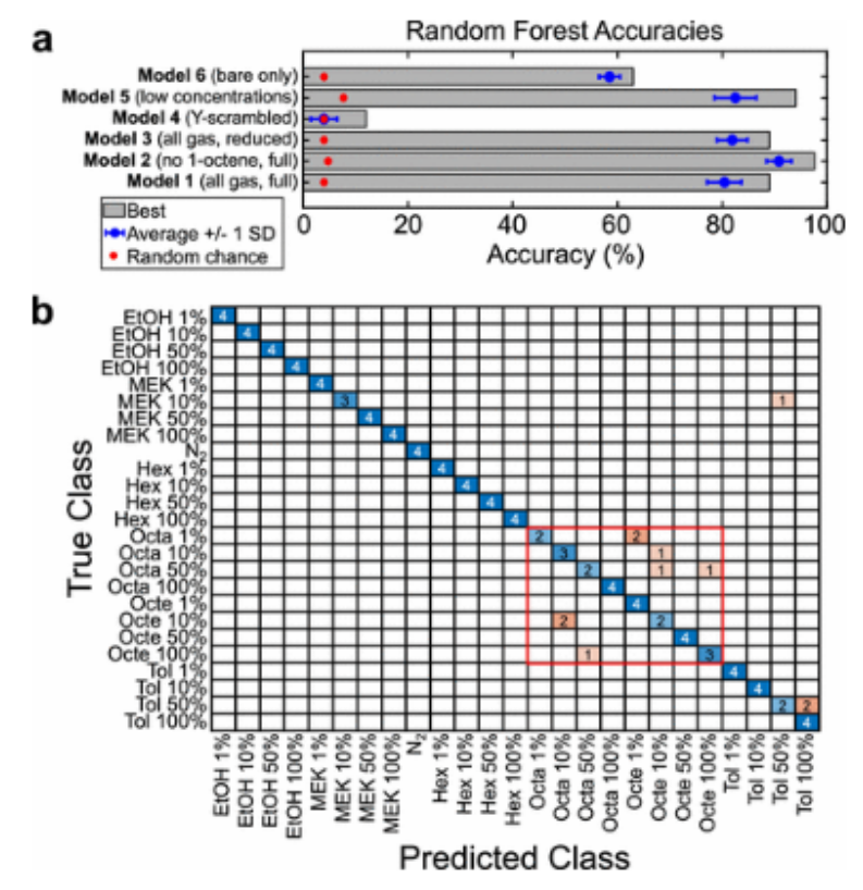 揮發(fā)性有機(jī)化合物(VOCs)的快速檢測在許多行業(yè)越來越重要。非侵入性醫(yī)學(xué)診斷可能基于人類呼吸中揮發(fā)性有機(jī)化合物的特定組合;檢測真菌生長等環(huán)境危害排放的VOCs可以預(yù)防疾?。徊⑶铱梢酝ㄟ^監(jiān)測食物儲存過程中產(chǎn)生的氣體來減少浪費(fèi)。電子鼻已經(jīng)應(yīng)用于這些問題,然而,一個常見的限制是提高選擇性。石墨烯是一種適應(yīng)性強(qiáng)的材料,可以用許多化學(xué)受體進(jìn)行功能化。在這里,我們使用這種多功能性來演示使用基于石墨烯的可變電容器(變?nèi)荻O管)陣列在不同濃度下選擇性和快速檢測多種VOCs。每個陣列包含108個傳感器,這些傳感器用36個化學(xué)受體功能化以實現(xiàn)交叉選擇性。來自108個傳感器的多路復(fù)用器數(shù)據(jù)采集在幾十秒內(nèi)完成。雖然這種快速測量降低了信號幅度,但使用監(jiān)督機(jī)器學(xué)習(xí)進(jìn)行分類顯示,在5種分析物(乙醇、己醛、甲基乙基酮、甲苯和辛烷)之間,在4種濃度下,準(zhǔn)確率為98%。加入1-辛烯(一種結(jié)構(gòu)與辛烷高度相似的分析物)后,準(zhǔn)確度達(dá)到89%。這些結(jié)果證明了分析方法選擇的重要作用,特別是在存在噪聲數(shù)據(jù)的情況下。這是充分利用石墨烯傳感器陣列進(jìn)行快速氣體傳感應(yīng)用的重要一步,從環(huán)境監(jiān)測到人類呼吸中的疾病檢測。