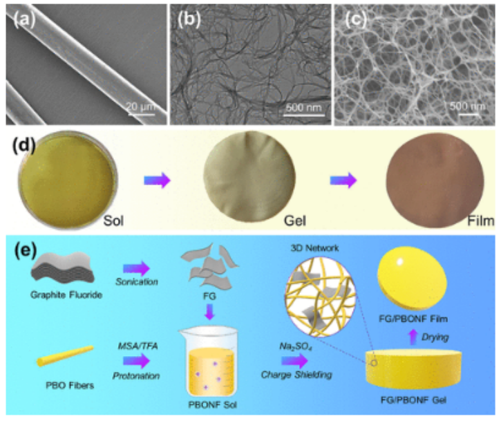 圖1.編制PBONF和FG/PBONF。(a) PBOMF的SEM圖像。(b) PBONF的TEM圖像。(c) 含有3D互連網絡的PBONF凝膠的SEM圖像。(d) 溶膠-凝膠-薄膜轉化過程的照片。(e) FG/PBONF復合薄膜制備工藝示意圖。