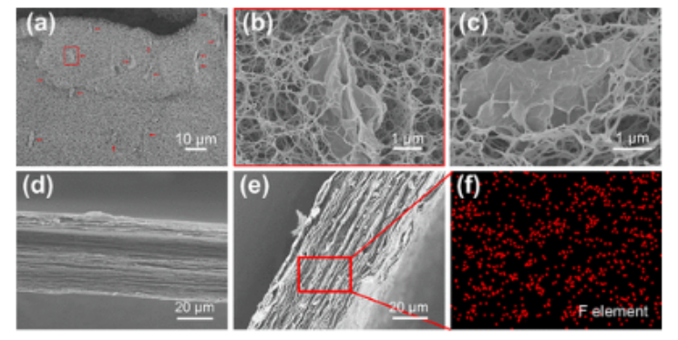 低介電材料在微電子學中得到了廣泛的應用,但受到機械性能和導熱性差的限制。本研究通過用3D互連的聚對亞苯基苯并雙惡唑(PBO)納米纖維網絡代替傳統的聚合物基體,開發了一類基于氟化石墨烯(FG)的納米復合薄膜。FG納米片均勻分布在PBO納米纖維(PBONF)的多孔網絡中,有序堆疊,形成珍珠層狀層狀結構,同時鋪平了有效的熱傳導路徑。最終,FG和PBONF之間的強界面結合和高效協同作用賦予了復合薄膜無與倫比的拉伸性能(強度和模量分別高達295.4 MPa和7.79 GPa)和耐折性(1000倍后拉伸性能不會下降),超低介電常數(低至1.71)和出色的導熱性(12.13 W m