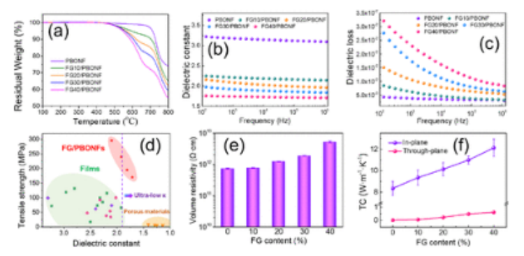 圖4.FG/PBONF的多功能特性。(a) 熱重曲線。(b) 在不同頻率下測量的介電常數和(c) 介電損耗。(d)阿什比圖表明,在這項工作中開發的FG/PBONFs達到了新的機械強度和介電性能水平,超過了所有其他報告的低κ材料。(e) 體積電阻率隨FG含量的變化。(f) 面內和通面TC對FG含量的依賴性。
