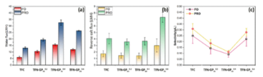 圖7.(a)水通量,(b)反鹽通量,以及(c)不同TFN膜在FO和PRO模式下的選擇性。