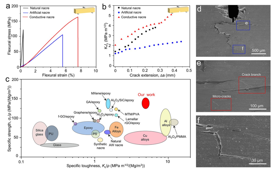 Figure 2. 機(jī)械性能。 (a)作為導(dǎo)電珍珠層、人工珍珠層和天然珍珠層彎曲應(yīng)變函數(shù)的彎曲應(yīng)力。 (b)導(dǎo)電珍珠層、人工珍珠層和天然珍珠層的抗裂紋擴(kuò)展曲線。 (c)不同天然和人工材料的比強(qiáng)度與比斷裂韌性的阿什比圖。 (d)具有長程鋸齒形裂紋撓度的導(dǎo)電珍珠層的斷口。 (e)d中藍(lán)色框區(qū)域的放大圖像。紅色框區(qū)域表示裂紋分枝和微裂紋。 (f)從d中藍(lán)色框區(qū)拍攝的放大圖像,顯示界面處的摩擦和導(dǎo)電珍珠層中向裂紋路徑末端的裂紋橋接。