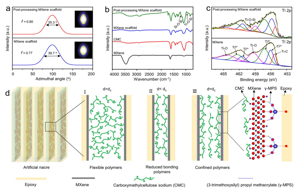 Figure 3. 珍珠層啟發(fā)的MXene/環(huán)氧層狀塊體納米復(fù)合材料中的界面相互作用和聚合物約束。 (a)MXene板層支架的二維SAXS圖像和方位角(φ)圖。 (b)對MXene、CMC、MXene片狀支架及后處理MXene片狀支架的FT-IR分析。 (c)純MXene和后處理MXene片狀支架Ti 2p區(qū)的XPS譜圖。 后處理MXene片層支架上Si-O-Si和Ti-O-Si特征峰的增加表明接枝成功。 (d)在珍珠層激發(fā)的MXene/環(huán)氧層狀塊體納米復(fù)合材料中,在不同層間距離處MXene納米片之間的聚合物約束和化學(xué)鍵合示意圖。