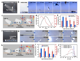 Figure 3. .由光驅動和調節的可控跳躍運動。 (A)MXene/PDMS跳躍驅動器的輕型跳高過程示意圖。 (B)不同時間下30°光照角下跳高過程的光學圖像。 (C)跳高過程中跳躍驅動器的受力分析。 (D)在跳高過程中,跳高驅動器的跳高高度和速度隨時間的變化。 (e)在不同光強的光照射下跳躍驅動器的高跳躍性能。 (f)MXene/PDMS跳躍執行器的輕型跳遠過程示意圖。 (G)在0°角光照下不同時間的跳遠過程光學圖像。 (h)跳遠過程中跳躍驅動器的受力分析。 (I)在不同光強的光照射下跳躍驅動器的跳遠性能。 (j)在不同照射角度的連續光照射下,驅動器質心的典型跳躍軌跡。