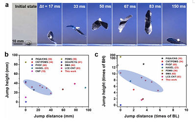 Figure 4. 與跳躍運動負荷和跳躍性能的比較。 (A)攜帶負載進行高跳的跳躍驅動器的光學圖像。 (b,c)與其它已報道的軟驅動器的跳躍性能(跳躍高度和跳躍距離)進行了比較。 這里BH和BL分別代表執行器的本體高度和本體長度。
