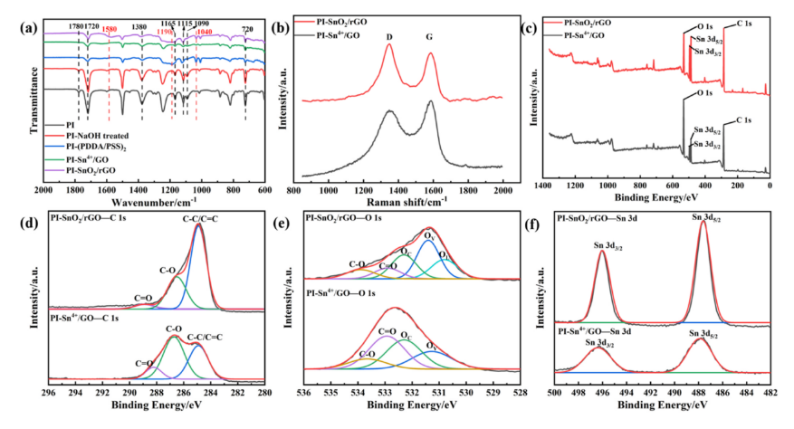 4+/GO樣品的(a)FT-IR光譜,(b)拉曼光譜,(c) XPS全光譜,(d) C1s光譜,(e) O 1s光譜和(f) Sn3d光譜。