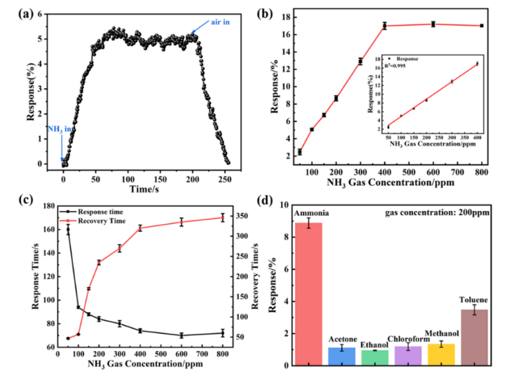 2/rGO在室溫下對100ppm氨的響應-恢復曲線,(b)隨氨濃度的響應(插圖為50- 400ppm濃度范圍內的線性擬合曲線),(c)不同氨濃度下PI-SnO