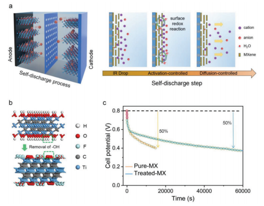 基于MXenes的超級電容器具有超高的容量電容、高功率特性和良好的循環(huán)性能,是一種極具前景的電化學儲能器件。然而,它們有嚴重的自我放電行為,而潛在的自我放電機制尚不清楚。本文提出了一種基于生物熱處理的表面工程策略,通過消除羥基末端來有效地修飾Ti