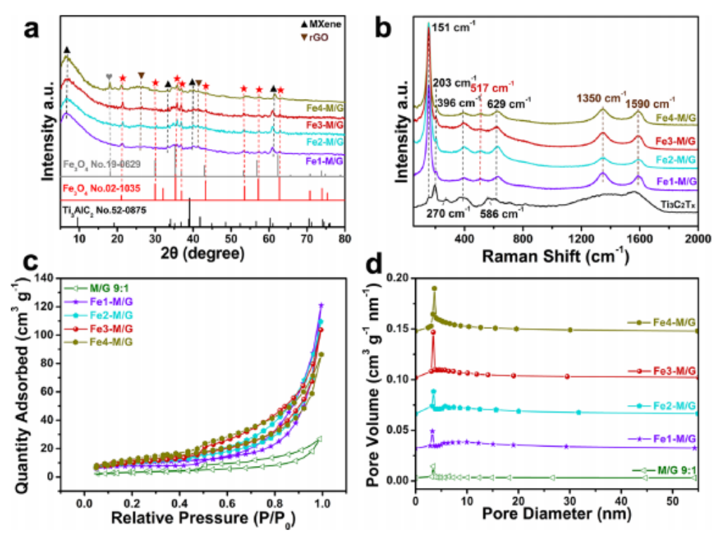 x和Fe-M/G氣凝膠的XRD圖和(b)拉曼光譜,(c) 77 K下氮氣吸附等溫線,(d) M/G 9:1和Fe-M/G氣凝膠對應的孔徑分布。
