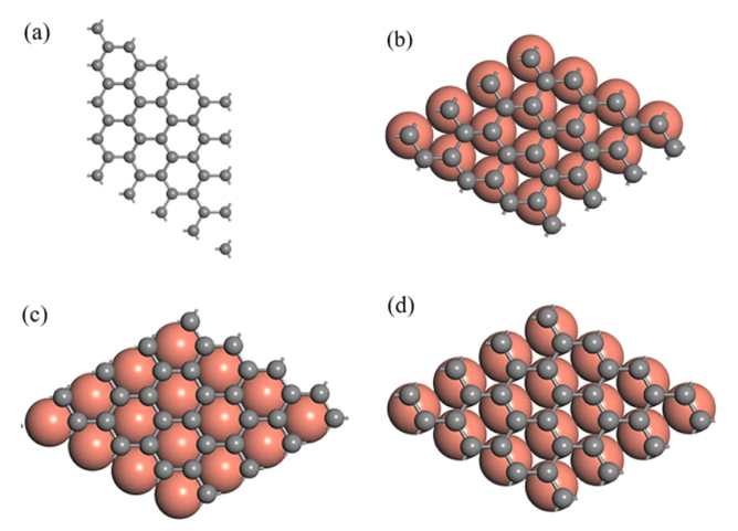 圖1. (a)石墨烯模型,(b)(111)/石墨烯Top模型,(c)(111)/石墨烯Hollow模型,(d)(111)/石墨烯Bridge模型。