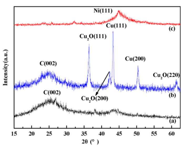 圖4. (a)石墨烯,(b) Cu@石墨烯, (c) Ni@石墨烯的XRD圖。