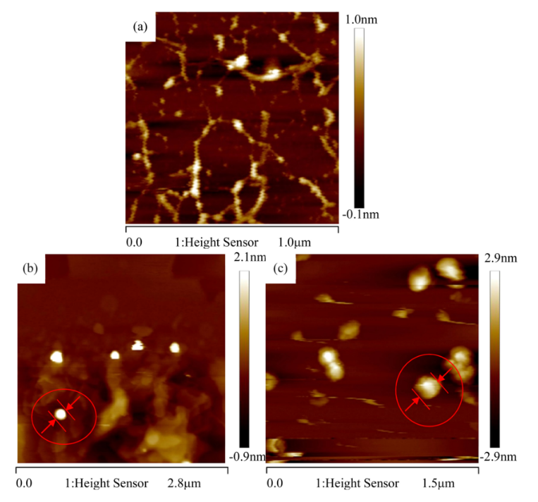 圖6. (a)石墨烯,(b) Cu@石墨烯, (c) Ni@石墨烯的AFM圖像。