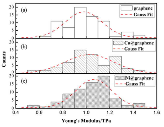 圖8. (a)石墨烯,(b) Cu@石墨烯, (c) Ni@石墨烯的楊氏模量的直方圖和高斯擬合。