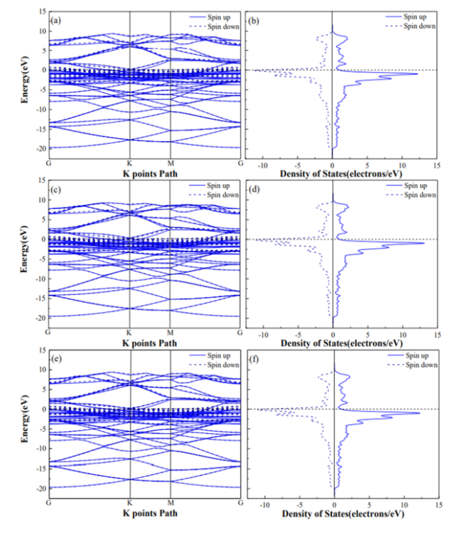 圖11. Ni(111)/石墨烯三種吸附模型的能帶結(jié)構(gòu)圖和態(tài)密度圖:(a,d) Top, (b,e) Hollow, (c,f) Bridge。