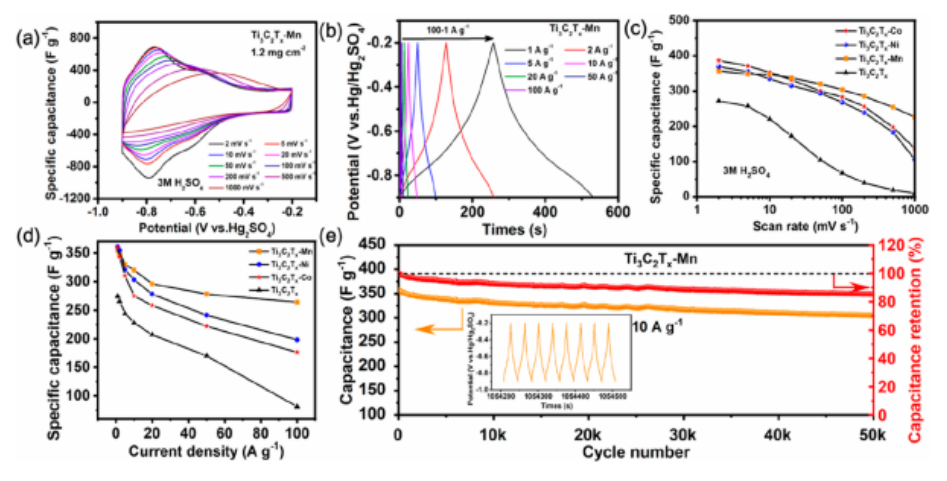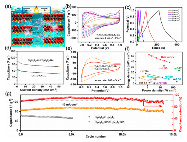 −3。我們認為,該工作為后期MXene層間距的調(diào)控和多孔結(jié)構(gòu)的設(shè)計提供了思路,可廣泛應(yīng)用于下一代高能密度和功率密度的實際應(yīng)用中。