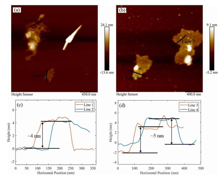 Fig 6. (a) rGO 和 (b) PDA-rGO 的AFM圖像以及 (c) 1-2 行和(d) 3-4行的相應高度。