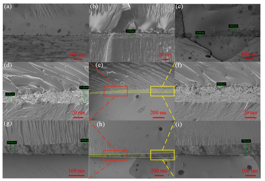 Fig 8. 具有 (a) 無芯層、(b) 0.25 wt‰ rGO 芯、(c) 1 wt‰ rGO 芯、(e) 0.5 wt‰ rGO 芯和 (h) 0.75 wt‰ rGO 芯的夾層復合材料的斷裂表面 SEM 圖像和放大圖 (d)、(f)、(g)、(i) SEM 圖像中相應的紅色和黃色框區域。