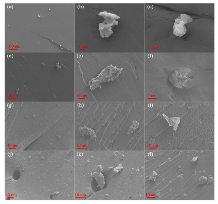 Fig 10. 質量分數為(a) 0.5 wt‰、(d) 1 wt‰的PDA-rGO-mixed-EP、質量分數為(g) 0.5 wt‰的rGO-mixed-EP、( j)1 wt‰和(a)的放大圖(b-c),(d)的(e-f),(g)的(h-i),(j)的(k-l)。