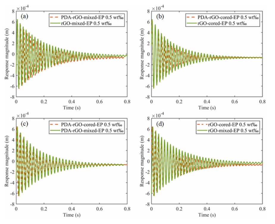 Fig 17. 環氧樹脂與質量分數為 0.5 wt‰ 的復合材料的振動衰減曲線比較:(a) PDA-rGO-mixed-EP,(b) rGO-mixed-EP,(c) PDA-rGO-cored-EP 和 ( d) rGO-cored-EP。