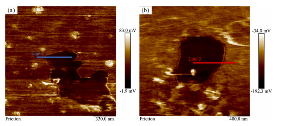 Fig21. (a) rGO 和 (b) PDA-rGO 的橫向力模式下的 AFM 圖像。