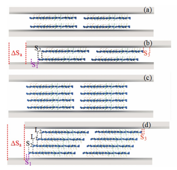 Fig 23. (a-b) 低質量分數和 (c-d) 高質量分數的夾層復合材料的層間和層內滑移示意圖。