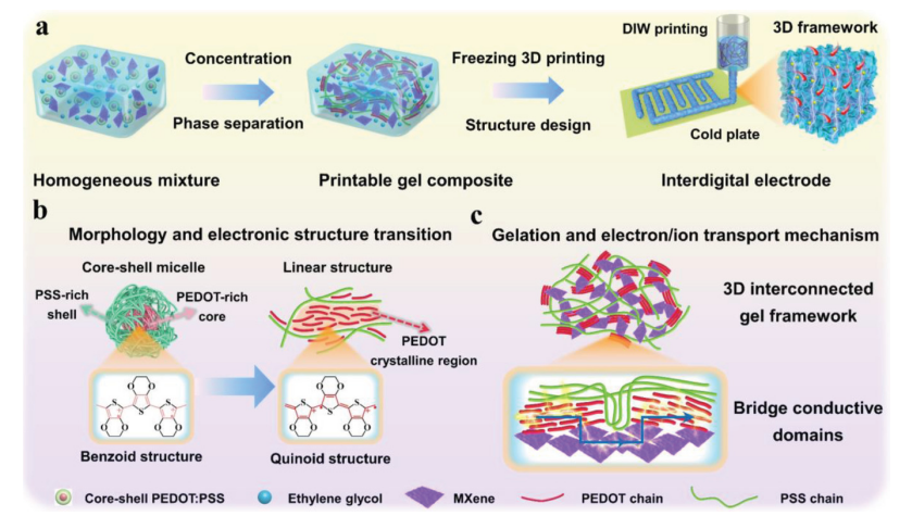 Fig 1. 用于 MSC 設備的 PME 凝膠復合材料的 3D 打印。a) 3D 打印 PME 凝膠復合油墨和叉指電極的制備示意圖。b) PEDOT:PSS 在 PME 凝膠復合材料中的形態和電子結構轉變。c) PME 凝膠復合材料的凝膠化和電子/離子傳輸增強機制的示意圖。
