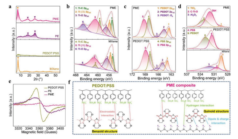 Fig 2. PME 凝膠復合材料的化學表征和電子結構轉變。a) PEDOT:PSS、MXene、PE 和 PME 的 XRD 圖譜。b-d)分別為 PEDOT:PSS、MXene 和 PME 復合材料的高分辨率 Ti 2p、S 2p 和 O 1s 光譜。e) 凍干 PEDOT:PSS、PE 和 PME 的 ESR 光譜。f) PEDOT:PSS 的電子結構轉變示意圖。
