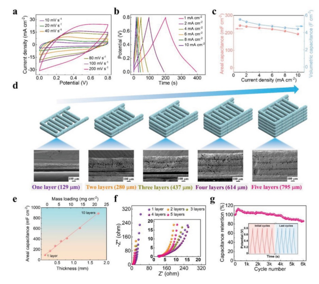 -2的電流密度下,具有不同電極厚度的 PME MSC 的面電容。f) 具有不同層的 PME MSC 的奈奎斯特圖。插圖顯示高頻區域。g) PME MSC 在10 mA cm