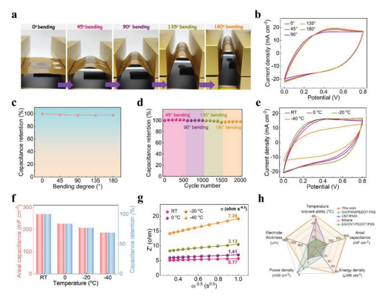 Fig 5. PME MSCs 的變形和耐低溫性能。a) 顯示 PME MSCs 在不同彎曲角度下發生彎曲變形的光學圖像。b) PME MSC在不同彎曲度下的CV曲線。c) PME MSC在不同彎曲度下的電容保持率。d) PME MSC 在一系列循環彎曲變形下的電容保持率。e) PME MSC在各種低溫下的CV曲線。f) PME MSC在各種低溫下的比面積電容和電容保持率。g) Z′與頻率平方根的倒數 (ω