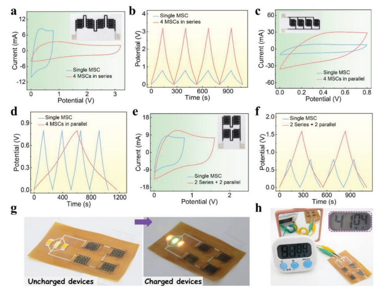 -2下測得的 GCD 曲線兩個MSC串聯和兩個MSC同時并聯的集成器件與單個MSC的比較,(e)的插圖顯示了兩個MSC串聯和兩個MSC同時并聯的集成器件的電路設計。g) 照片顯示帶有四個串聯 MSC 點亮 3 個 LED 的印刷集成設備。h) 照片顯示了一個印刷集成設備,有四個串聯的 MSC 為電子時鐘供電,插圖顯示超過 40 分鐘的供電時間。