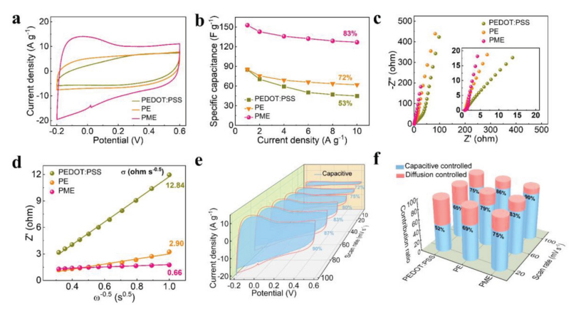Fig 7. 微觀結構對電化學性能的貢獻。a) PEDOT:PSS、PE 和 PME 電極在 100 mV s -1掃描速率下的 CV 曲線。b) PEDOT:PSS、PE 和 PME 電極在各種電流密度下的電容。c) PEDOT:PSS、PE 和 PME 電極的奈奎斯特圖。插圖顯示高頻區域。d) 線性擬合顯示了PEDOT:PSS、PE 和 PME 電極在低頻區域的Z′和 ω